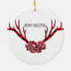 Enfeites de natal em forma redonda. Mostrado aqui em branco com texto de Feliz Natal e impressão de galhadas xadrezes. Duplo lado. Personalize este item ou comprar conforme mostrado.