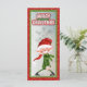 Feliz Natal Sorrindo Cartão Plano Elf. Elfo sorridente em um fundo branco e brilhante, couro verde e vermelho. Foto e texto editáveis.