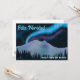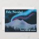 Luzes de norte roxas e azuis brilham sobre montanhas cobertas de neve em uma noite fria no Alasca. O texto em espanhol, "Feliz Navidad", aparece em azul e branco brilhantes. Adicione seu próprio texto adicional.