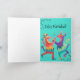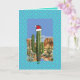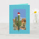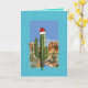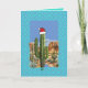 "Feliz Navidad!" Cartão de Saudação de Natal dobrado. Celebre o feriado com uma reviravolta única no sudoeste! Este cartão festivo apresenta uma encantadora cena do deserto na frente, onde um cacto saguaro veste orgulhosamente um chapéu de Papai Noel, e está cercado num belo quadro de azulejo colorido de turquesa, trazendo um toque de magia de Natal para a paisagem árida. Dentro, dois lhamas alegres dançam juntos, espalhando calor e alegria com a legenda "Feliz Navidad!" Quer você esteja enviando desejos de feriado para pessoas amadas perto ou longe, este cartão captura o espírito do Natal com uma mistura deliciosa de tradição e capricho. Perfeito para quem aprecia uma mistura de alegria e charme do deserto!