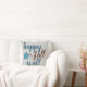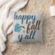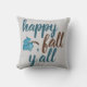 Almofada divertida de outono! Tipografia moderna em azul turquesa e marrom diz "feliz outono para todos" ao lado de uma folha caída encantadora. Fundo cinza suave. Ótimo para o Outono!