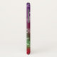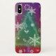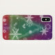 Um espalhamento de flocos brancos de neve, folhas e bagas ocas, estrelas, e pinheiros contra um fundo brilhante de vermelho, laranja, ouro e roxo, com uma forma de árvore de Natal verde e macia no meio.