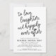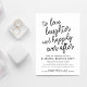 Nosso janto de ensaio de casamento moderno e casual ou convites de festas de coquetel em preto-e-branco "para amar, rir alegremente para sempre" em tipografia de roteiro preto com seus detalhes de janto de ensaio embaixo. Cartões invertendo para um padrão festivo de confete preto e branco. Inclui espaço para a época do ensaio e endereço da igreja ou do local.