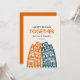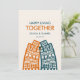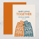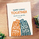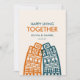 Cartão feliz por viver junto com edifícios da cidade em estilo retrô de desenho animado.