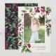 Mande cartões de natal para amigos e família em estilo chic com nossos cartões com fotos elegantes. Os primos graciosos da folhagem de cor d'água pintada e os bagos vermelhos profundos enquadram sua foto vertical ou orientada a retratos, com sua saudação personalizada (mostrada com "alegria ao mundo") e seu nome de família, enfiados no canto inferior direito. Cartões ao contrário revelam um padrão botânico de inverno correspondente.