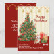 Feliz Natal Feriados Cartão de Natal para Bulldog Inglês Festivo e elegante. Os ornamentos de aquarela pintados à mão, em uma árvore ponteada em estrela e presentes especiais, até mesmo um osso para o cachorro envia uma mensagem de feliz aniversário. Este Cachorro Inglês está vestindo seu chapéu especial de Papai Noel. O fundo da design é uma faixa amarela e cremosa com uma terra de estrelas cintilantes de ouro. Todo o texto é editável, do "Feliz Howlidays" à mensagem de Natal com seu nome de família e cão. Use a opção PERSONALIZAR para torná-la sua. A parte traseira do cartão é um vermelho correspondente à garland e uma mensagem de feriado editável. Você encontrará este belo cartão de Natal junto com muitas outras raças de cães em nossa coleção de HOWLIDAYS FESTIVOS FESTIVOS FELIZES, em nossa loja. Mensagem se precisar de ajuda.