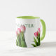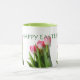 Diga o "felz pascoa!" com esta caneca bonita. Uma fotografia original de tulipas frescas bonito do rosa do corte é por todos os lados. Fácil personalizar e mudar o texto com algum nome, dizer, ou mesmo deixar para fora as palavras se você quer para uma caneca floral agradável. Ou, mude facilmente a cor de acento verde mostrada do copo demasiado.