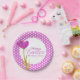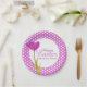 Placas de papel tulipa de páscoa brilhante modernas em roxo verde e branco. Bonito arte de tulipa d'água e borda bolinhas. As placas podem ser personalizadas com o nome da sua família ou evento de Páscoa. Arte com aquarela original e design por Sarah Trett. www.sarahtrett.com para www.mylittleeden.com