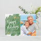 A design da carta de feriados felizes da praia minimalista da Boutique Co. náutica apresenta a tipografia moderna escrita manual e a sua foto-retrato favorita (proporção 5x7). O design é acentuado com manchas douradas de aquarelas e estrelas-do-mar de cor aquática, para um tema divertido de férias tropicais, e é colocado num rico fundo de amostras de aquarela verde de Natal. #FelizNatal #CartõesFeriados #Feriados Tropicais