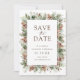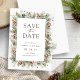 Este elegante inverno salva o cartão de anúncio de data apresenta verde-aquarela pintada manualmente e pinecones organizados como uma bela coroa. O texto é castanho e o fundo é branco. A parte traseira inclui um buquê na moda. Localize itens correspondentes na coleção Pinecone e Greenery Christmas Holiday.