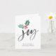 Este cartão de feriado dobrado é simplesmente na moda e faz uma declaração em negrito com sua simplicidade e sentimento. O design é minimalista e artístico com alegria inscrita em letras de pincel, e apresenta nosso exclusivo padrão colorido de água pintado à mão e traçados de pincel de aquarela no dentro. Traga alegria aos entes queridos este ano com este simples cartão na moda. Adicione a sua mensagem pré-impressa no dentro usando os modelos fornecidos para fazer com que o cartão de feriado deste ano escrevendo uma brisa!
