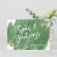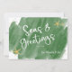 O design do cartão de feriado "Mar e Saudações Tropicais" da Boutique Co. náutica apresenta a tipografia moderna escrita à mão e os sotaques a cores-d'água para um tema de férias divertido. "Seas & Saudações" está em tipografia branca definida em um rico fundo de amostras de aquarela verde de Natal com manchas de ouro. #FelizNatal #CartõesFeriados #Feriados Tropicais