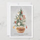 Árvore de Natal de pinho verde tradicional no cesto. Decorado com um preguiçoso, chifre francês e ornamentos clássicos vermelho e branco. Duas linhas de texto abaixo, deixe você personalizar seu cartões de natal.