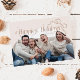 Cartão de modelo de Foto de Natal bonito com um texto que diz "feriados mais felizes". Adicione as fotos da sua família neste cartão de quadro de arco bege. Há uma ilustração de um arco.