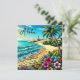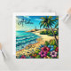 Aloha! Bonito costa tropical costeira. Bonito água azul, palmeiras, flores tropicais e um farol no fundo. Ai arte feita no estilo de pop de quadrinhos.