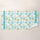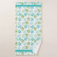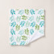 Bonito toalha da sala de banho, com uma folha verde-menta, verde-oliva e verde-lacrimogêneo, sobre fundo branco, sobre o pano de lavagem e a toalha de banho. Uma fita decorativa em teal atravessa ambas as extremidades da toalha do banho e corre na vertical em tiras ao fundo da toalha da mão.