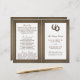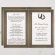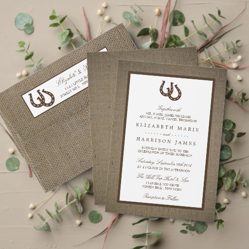 Estes programas duplos são perfeitos para qualquer casal que planeje um casamento rústico do país. A design apresenta duas ferraduras marrons de sorte em um fundo de efeito de burlap rustic. O design simples pode ser personalizado para se adequar ao seu evento especial e será a ordem de serviço perfeita para qualquer partido de chic no país, incluindo chás de panela, noivados, chás de casamento, festas de aniversário e muito, muito mais.