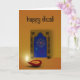 Feliz Ilustração Diwali: diya vermelha (uma lâmpada de óleo índio em forma de xícara) em frente a uma janela ornamental indiana com fogos de artifício do lado de fora.