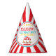 Vamos, vamos todos! Obrigado a todos por virem para a maior festa de aniversário debaixo do topo com o nosso carnaval vermelho e teal ao redor dos modelos. Esta etiqueta de aniversário de ingresso de circo apresenta um fundo vermelho de tenda de circo com um carrossel vermelho e teal em uma design de chapéu.