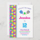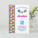 Convite de aniversário verde, rosa, amarelo e roxo Pickleball. Totalmente personalizável. Dois redemoinhos coloridos e picleball verde. Com placa RSVP na parte traseira