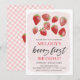 Este convite de festa de 1º aniversário do morango apresenta morangos pintados à mão originais em um fundo rosa claro.