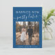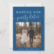 Moderno elopemento azul clássico ou cartão de anúncio de casamento menor para que a família e os amigos saibam que seus planos de casamento mudaram, exigindo que você fuja ou reduza o número de convidados no seu casamento para um pequeno grupo íntimo, mas que você vai receber uma festa de celebração ou uma recepção no futuro. A frente apresenta sua foto e "Casado Agora, Festa Mais Tarde" em uma mistura de uma simples tipografia branca e um roteiro branco com traços. Em sua foto, adicione seus primeiros nomes e a data do casamento. Ao contrário, personalize sua mensagem com mais detalhes e adicione seus nomes em um script de assinatura.