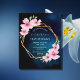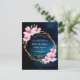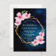 Um convite de aniversário floral tropical 50º (ou qualquer idade) com flores de hibisco cor-de-rosa, verde e uma estrutura geométrica falsa de ouro. Um céu azul escuro como fundo. Modelos para um nome escrito com um script de estilo manuscrito moderno, modelos para suas informações de partido. Texto branco. Perfeito para uma festa de verão, piscina ou praia! Traseira: placa de posto simples. Dica: Se você não quiser que pareça um cartão postal, clique em personalizar, vá para o verso e remova o divisor e o carimbo de posto.