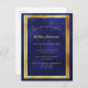 Um cartão de convite de aniversário moderno, moderno 50º (ou qualquer idade) para homens, caras, homens. Um fundo azul escuro, azul marinho. A cor azul é irregular. Com uma falso moldura dourada e um sprinkle confetti de ouro, letras coloridas de ouro. Modelos para informações sobre a sua parte. Traseira: design de cartão postal simples.