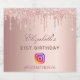 Um adesivo para uma festa de aniversário de 21ª (ou qualquer idade) entre giros e glamourosos. Um fundo rosa dourado com pingos de pincel, pintura com pingos. O ícone Instagram. Personalize e adicione um nome, evento e seu evento Instagram #hashtag.