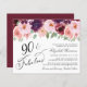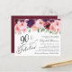 Convite de aniversário elegante e econômico com "90 & Fabuloso" em um roteiro de caligrafia de na moda e buquês de aquarelas de flores vermelho e rosa-burgundy, com verde-sábio.