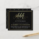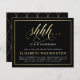 Orçamento Dourado e Convite de aniversário de Surpresa Negra por Designs Eugene. Envie esses convites minimalistas de preto e ouro e comece sua festa surpresa ao estilo! Na frente, em um script de estilo manuscrito a na moda é o texto "shhh..." em folha de ouro falsa. Ao contrário, há um padrão de folha de ouro falso-elegante em fundo preto.