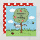 Um doce convite para celebrar um aniversário. A carta apresenta uma cena colorida de jardim com uma macieira, um mamangabo zunhando e uma joia de pássaros esfregando no chão.