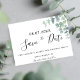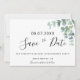 Um moderno Salve a placa para uma festa de aniversário 50th (ou qualquer idade). Um pano de fundo branco chic decorou verde de eucalipto verde, folhas e galhos. Personalize e adicione uma data e nome/idade 50 e o local do local. Letras pretas coloridas. O texto: Salvar a Data é gravado com um script de estilo com letra de tendência grande. Verso: cor verde do fundo.