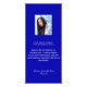 menu festa de aniversário. Personalize e adicione um nome, idade e menu. Um fundo azul real. Letras brancas coloridas. Adicione uma foto e fatos divertidos sobre a aniversariante. Remova os nomes se não for necessário