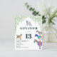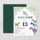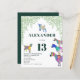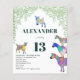 Cabras coloridas em rosa vibrante, roxo, azul, laranja, amarelo e aqua com um fundo de folhagem verde. Um convite de festa de 13º aniversário econômico e fofo com animais da fazenda, com cabritinhos e cabras em cima de cabras. Este convite de festa divertido é fácil de personalizar para criar um convite de festa único adequado para crianças e adultos amantes de cabras. Ilustrações originais de cabras psicodélicas coloridas pela artista Catherine Sweetman