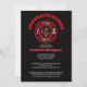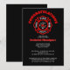 Convites de festas de anúncios de graduação de bombeiro em vermelho, preto e branco - Leitores em Parabéns vermelho brilhante, curvos no topo. Segue-se o logótipo clássico de combate a incêndios, a cruz maltesa, a preto, branco e vermelho, com ícones de bombeiro como escada, capacete, hidrante, machado, etc., e diz "Bombeiro". Sobre fundo preto. Personalizado com o nome do formando na correspondência de letras vermelhas com efeito de sombra. Informações de festa de formatura personalizadas, incluindo detalhes de RSVP, impressas em letras brancas e clássicas. Basta preencher seus próprios detalhes de festa de formatura de bombeiros com o modelo de texto fácil de usar. A parte de trás corresponde ao fundo preto. Sinta-se livre para mudar o plano de fundo para qualquer cor. Também temos presentes de graduação temática de bombeiros no nosso compro Zazzle.com/angela65*.
