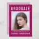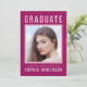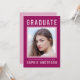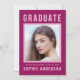 Anúncio de graduação roxo e convite de festas de formando. O convite tem um lado roxo leve nas costas. Personalize-o substituindo o texto do marcador de posição e substitua a foto do marcador de amostra/marcador de posição por sua própria foto. Para obter mais opções, como alterar a fonte e seu tamanho/cor ou o espaçamento entre letras, clique no botão "Personalizar". *Observe que a Marca d'água do Zazzle que aparece na visualização de zoom NÃO aparecerá no produto impresso final. © Rosewood e Citrus