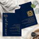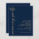 Caligrafia orçamental Código QR Marinho Azul e Dourado Convidados do Partido de Casamento Noturno. Um alternativo com preço inferior a 4,5 x 5,6" em semigloscópio de 110 gsm, semelhante em espessura a um cartão postal. Adicione seu código QR ao seu site de casamento no verso faz com que esta seja uma opção conveniente para seus convidados para RSVP e veja todos os detalhes sem a necessidade de RSVP separado e cartões de detalhes. O script de na moda é girado para o lado esquerdo, com todos os detalhes elegantemente para a direita com muito espaço em branco para uma sensação contemporânea. Personalize facilmente com seus detalhes. E altere a cor do texto e do plano de fundo, se desejar, através da opção editar mais.