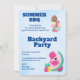 Um convite para CHURRASCOS de quintal. Uma bela ilustração flamingo com melancias e abacaxi. Testes de Sorvete ilustram este convite de verão. Fundo azul claro.