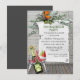 Garrafa de vinho com uma flor de Strelitzia escultural de haste única e um arbusto de sálvia para uma festa de despedida