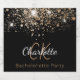 Para uma festa de despedida de solteira elegante. Um fundo preto chique com manchas de glitter dourado falso. Personalize e adicione um nome e iniciais do monograma. O nome é escrito em cor dourada com um estilo de letra manuscrita moderna. Letras brancas e douradas.