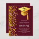 Um convite moderno e elegante para a Festa de formatura. Um fundo burguês decorado com confete dourado falso e um grande boné de formatura com tassel. Personalize e adicione um nome e detalhes da parte. Texto branco. 1 folha = 1 convite impresso de borda a borda.