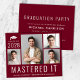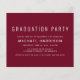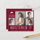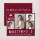 Convite de formatura de mestrado em vermelho burgundy econômico e convite de festa com colagem de 4 fotos, "Conquistou" escrito em letras brancas grandes e o ano de turma, nome e faculdade ou universidade em tipografia branca simples. No verso, adicione os detalhes da festa de formatura.