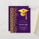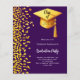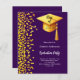 Um convite moderno e elegante para a Festa de formatura. Um fundo roxo decorado com confete dourado falso e um boné de formatura grande com tassel. Personalize e um nome e detalhes da festa. Texto branco. 1 folha = 1 convite impresso de borda a borda.