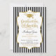 Um convite elegante de festa de formatura preta e dourada, com falso quadro de sotaque dourado e listras pretas e brancas com texto dourado e preto e um boné de formatura dourado. Esse convite para a classe de graduação é perfeito para a celebração de segundos graus, universidades, faculdades ou qualquer tipo de formando escolar.