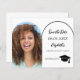Uma foto Salve o cartão de data de uma festa de formatura. Na frente: adicione sua própria foto vertical do formando. Quadro do arco fotográfico. Um fundo branco chic, texto preto. Modelos para um nome e data. O nome e o texto: Salvar a Data são escritos com um script de estilo moderno com letra manual. Com um boné, tassel superior. Voltar: detalhes da festa. 1 folha = 1 Salve a data da borda impressa para a borda.