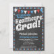 Um convite divertido e único para a festa de formatura de saúde no estilo do quadro-pessoal com bandeiras vermelhas, brancas e azuis e uma borda galopante com pontos nas costas.