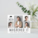 Anúncio de graduação e convite de festas de mestrados amigáveis com orçamento apresentando uma colagem de 4 fotos, "Mastered It" escrito na parte inferior em letras grandes e seu ano de aula, nome e faculdade ou universidade em tipografia simples. No verso, adicione os detalhes da festa de formatura.