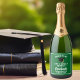 Esta etiqueta de vinho espumante de festa de formatura mais velho verde e branco moderna apresenta a tipografia típica do seu segundo grau ou nome da faculdade para a classe de 2025. Personalize com seu ano de graduação sob o script de chic manuscrito e boné preto para parabéns personalizados de excelente.