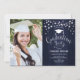 Convite para festa de formatura rustica com sua foto. Possui padrão de madeira, luzes de fadas de cordas, fontes de script e um boné de tassel.